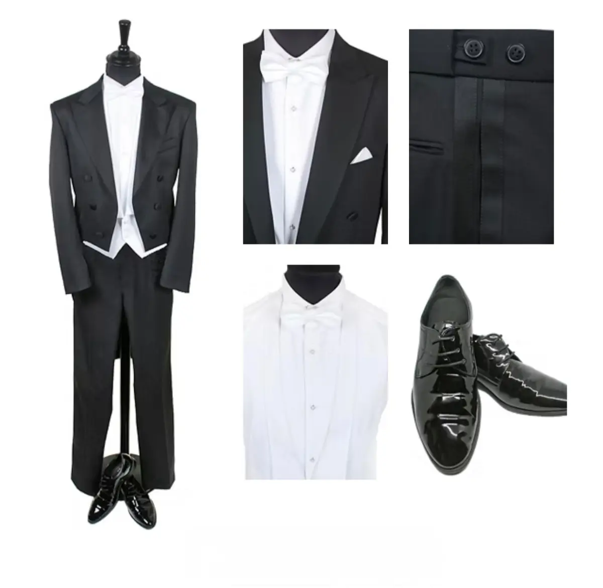 Frack - Tailcoat - white tie Unser Frackset beinhaltet die Komplettausstattung wie Frackhemd, Weste, Fliege, Lackschuhe, Manschettenknöpfe, sowie sämtliche Hemdknöpfe.